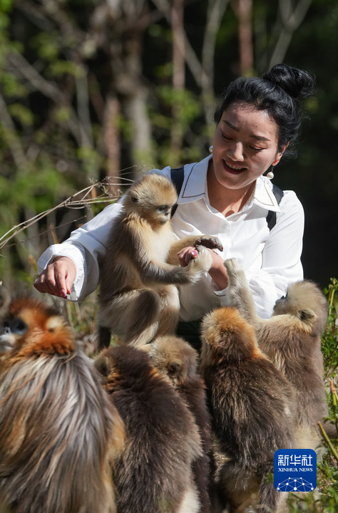 4月26日,在四川白河國家級(jí)自然保護(hù)區(qū)里,工作人員與川金絲猴在一起。新華社記者 江宏景 攝