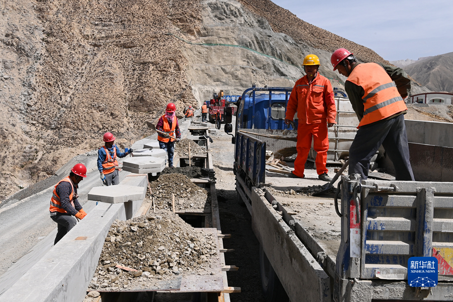 6月8日,在蓄集峽水利樞紐工程現(xiàn)場,施工人員進行大壩后預(yù)制塊鋪裝作業(yè)。新華社記者 范培珅 攝