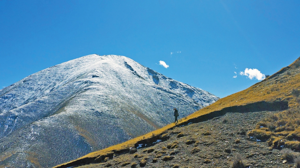 在世界屋脊研究野生動(dòng)物,免不了直面挑戰(zhàn)。雪豹喜歡陡峭的石壁和山崖,因此安放紅外相機(jī)必須克服恐高心理。2021年10月,在云塔村爬山布設(shè)紅外相機(jī)時(shí),我為了緊跟隊(duì)伍,沒(méi)來(lái)得及觀察周?chē)h(huán)境。當(dāng)穿過(guò)灌木到達(dá)監(jiān)測(cè)位點(diǎn)時(shí),才發(fā)現(xiàn)自己站在山脊線上,背后就是幾十米高的斷崖,立馬嚇得眩暈蹲下。檢查并重新安裝好紅外相機(jī)后,我們又爬完兩座山才完成了一天的工作。這一趟,我們創(chuàng)造了為追逐雪豹一天內(nèi)翻越3座山的紀(jì)錄。