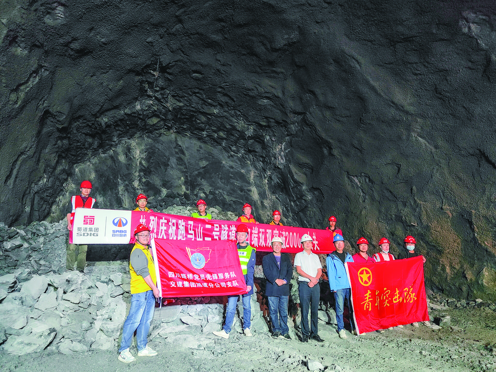 施工人員慶祝跑馬山二號隧道進(jìn)口端掘進(jìn)雙破2000米大關(guān)。