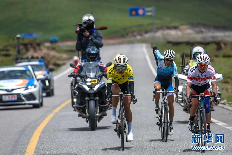 2021年7月17日,第二十屆環(huán)青海湖國(guó)際公路自行車賽進(jìn)行第七賽段——茶卡天空壹號(hào)至烏蘭的角逐。圖為參賽選手在比賽中騎行。新華社記者 張龍 攝
