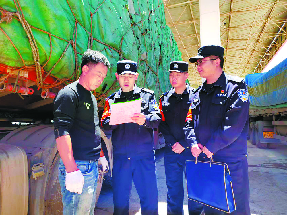 沱沱河站派出所所長(zhǎng)沈衛(wèi)平(左二)和民警們一起向客車(chē)司機(jī)宣傳愛(ài)路護(hù)路知識(shí)。青藏鐵路公安局格爾木公安處供圖