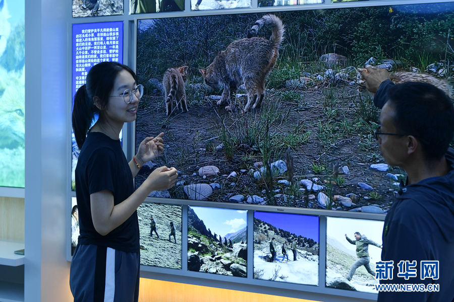 孔玥嶠和生態(tài)管護(hù)員正在查看野外布設(shè)的紅外相機(jī)的相關(guān)數(shù)據(jù)。新華網(wǎng) 卡婭梅朵 攝