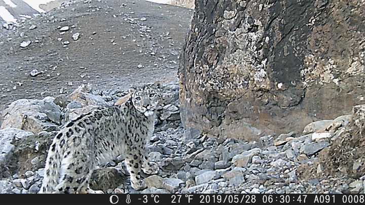 “我時(shí)常覺(jué)得,與其說(shuō)是我們觀察雪豹,不如說(shuō)是雪豹在觀察我們,它觀察我們,比我們觀察它要容易得多?!睋?jù)王大軍講述,有一次,團(tuán)隊(duì)追蹤到一只雪豹的身影停留在山間,但遠(yuǎn)遠(yuǎn)望去,只有一條尾巴露在外面。通過(guò)攝影設(shè)備拉近畫(huà)面,才發(fā)現(xiàn)原來(lái)那只雪豹的雙眼也正在透過(guò)巖石的縫隙,觀察著他們。
