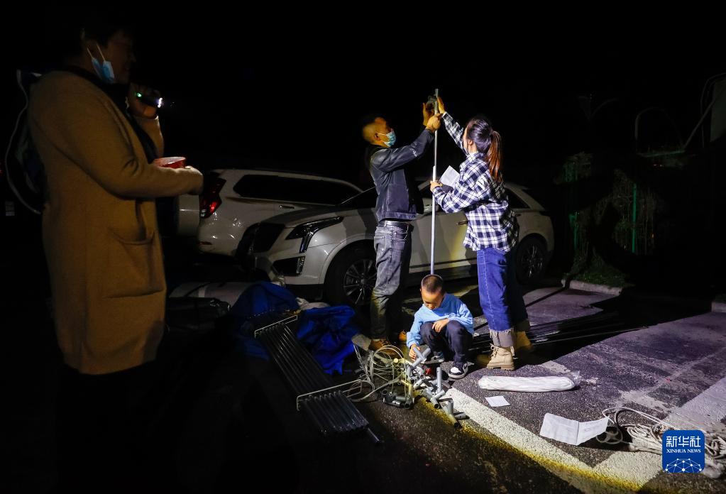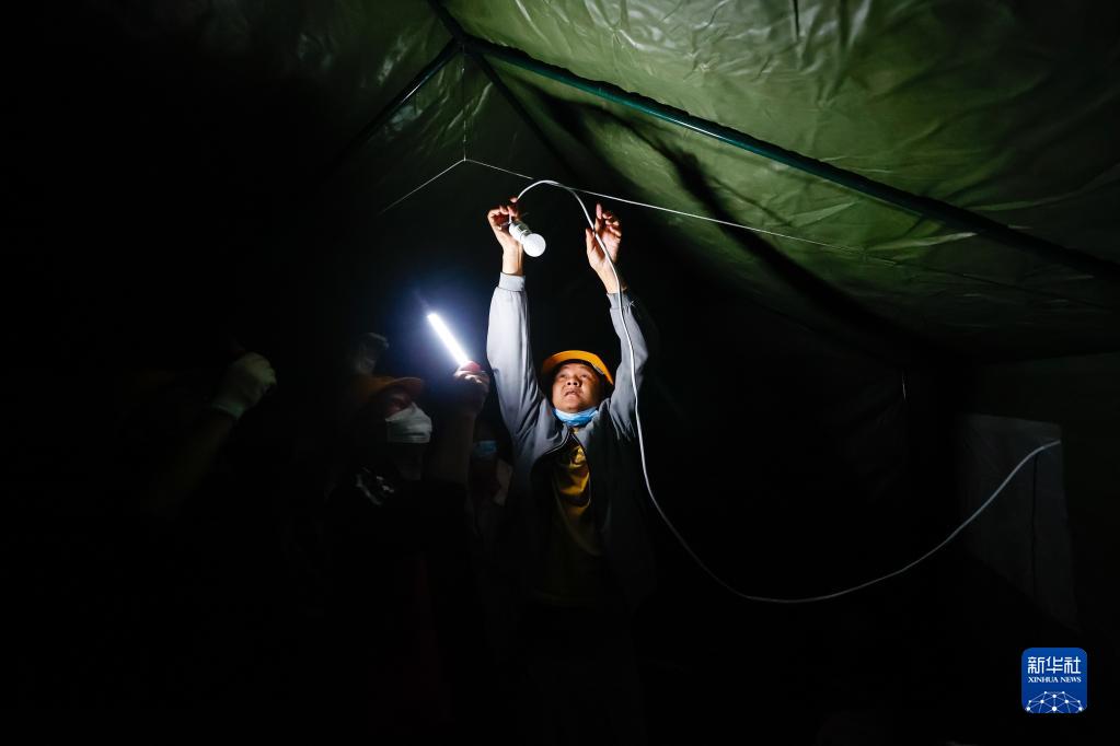 9月5日晚,在四川甘孜州瀘定縣磨西鎮(zhèn)的受災(zāi)群眾臨時安置點,工作人員安裝電燈。新華社 沈伯韓 攝