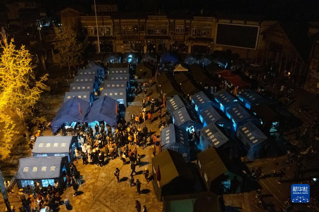 9月5日晚在四川甘孜州瀘定縣磨西鎮(zhèn)拍攝的受災(zāi)群眾臨時安置點(無人機照片)。新華社 沈伯韓 攝