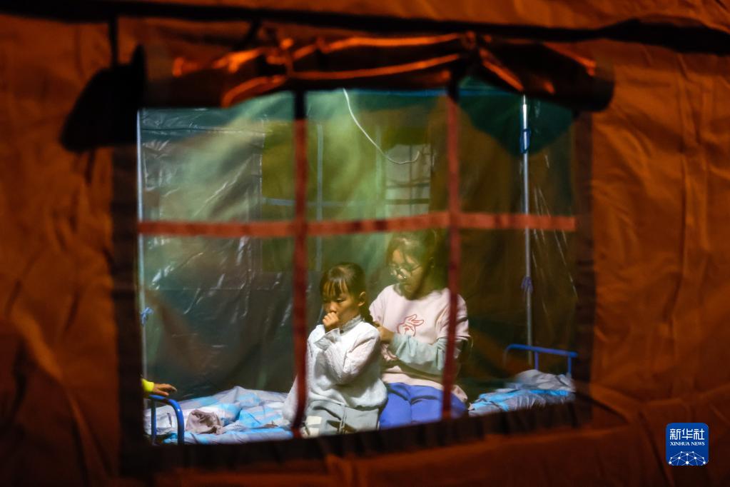 9月5日晚,在四川甘孜州瀘定縣磨西鎮(zhèn)受災(zāi)群眾臨時安置點,兩名小女孩在帳篷里。新華社 沈伯韓 攝
