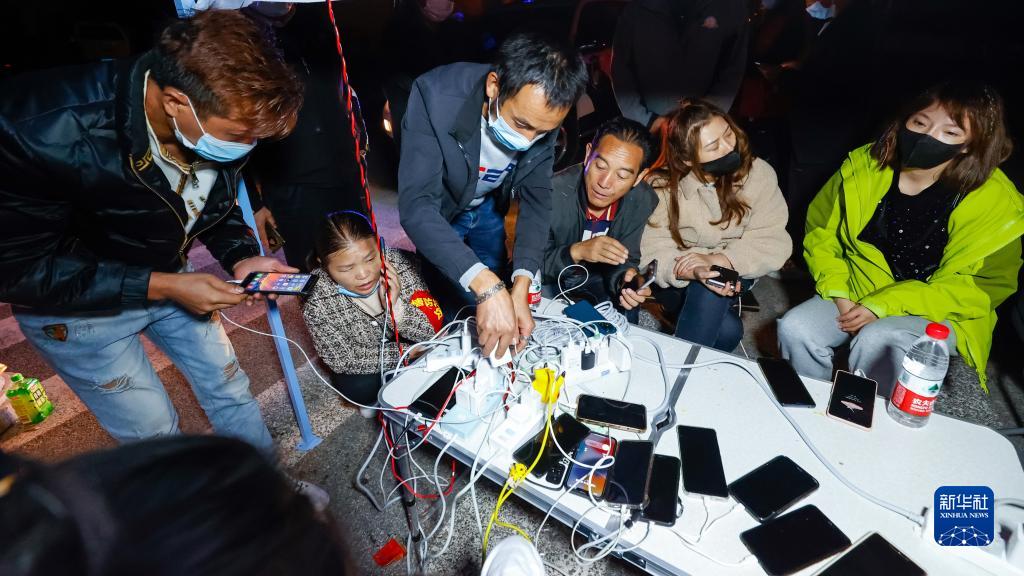 9月5日晚,在四川甘孜州瀘定縣磨西鎮(zhèn)的受災(zāi)群眾臨時安置點,人們在中國電信便民服務(wù)點為手機充電。新華社 沈伯韓 攝