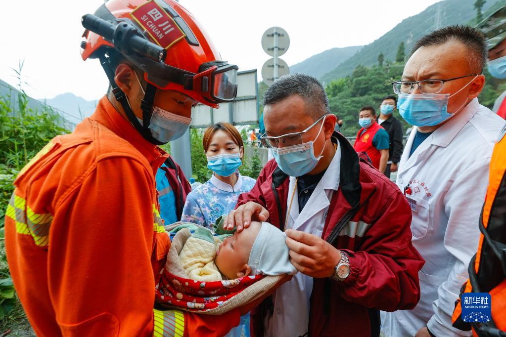 9月6日,阿壩森林消防支隊(duì)汶川大隊(duì)隊(duì)員張自立抱著一名從瀘定縣得妥鎮(zhèn)灣東村疏散出來(lái)的2個(gè)月大的嬰兒。新華社記者 沈伯韓 攝
