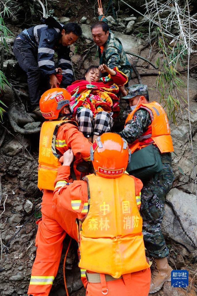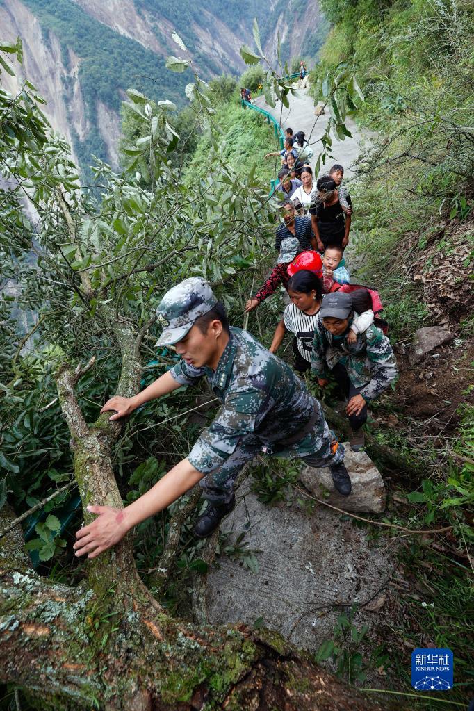 9月6日,救援人員幫助瀘定縣得妥鎮(zhèn)灣東村村民攀爬高山向外疏散。新華社記者 沈伯韓 攝