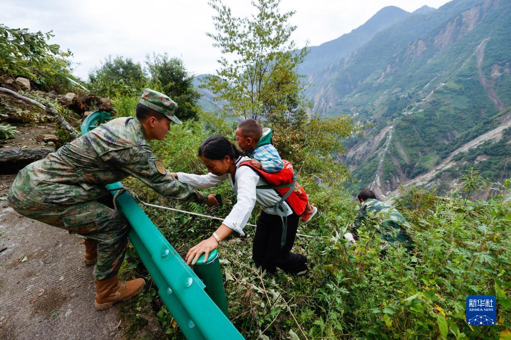 9月6日,救援人員幫助瀘定縣得妥鎮(zhèn)灣東村村民向外疏散。新華社記者 沈伯韓 攝