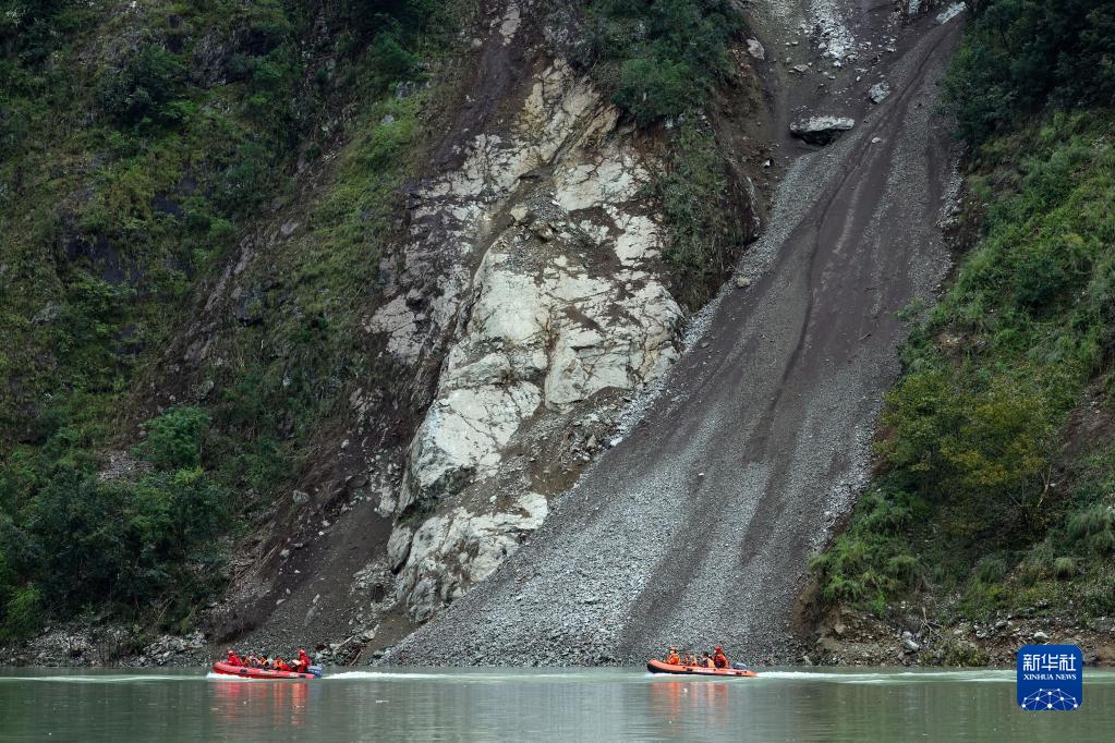 9月6日,救援人員乘坐橡皮艇經(jīng)水路,再爬山路進(jìn)入瀘定縣得妥鎮(zhèn)灣東村。新華社記者 沈伯韓 攝