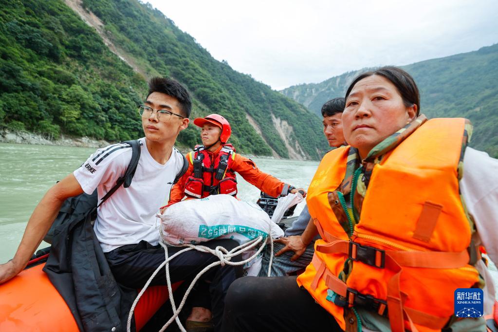 9月6日,從瀘定縣得妥鎮(zhèn)灣東村疏散出來(lái)的村民乘坐橡皮艇向外疏散。新華社記者 沈伯韓 攝