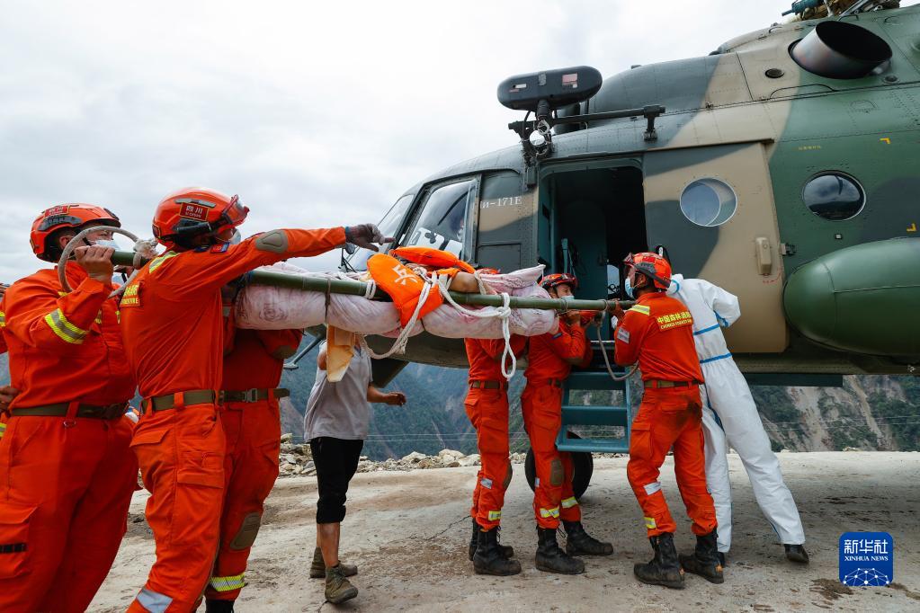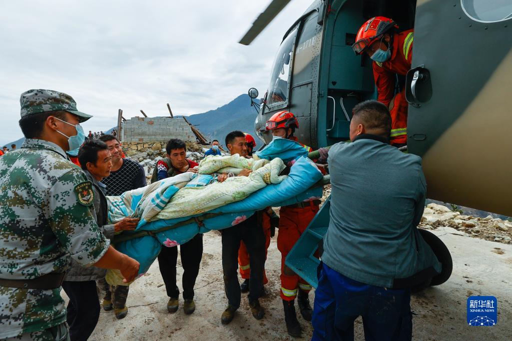 9月6日,救援人員抬著一名從瀘定縣得妥鎮(zhèn)灣東村疏散出來(lái)的受傷村民,準(zhǔn)備通過(guò)直升機(jī)將其運(yùn)出。新華社記者 沈伯韓 攝