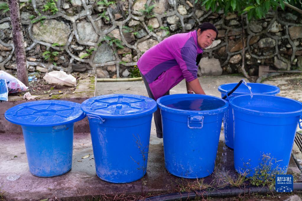 9月7日,在雅安市石棉縣王崗坪彝族藏族鄉(xiāng)幸福村二組,一名村民在接山泉水,這股山泉水是村民們從山上引下來的。新華社記者 才揚 攝