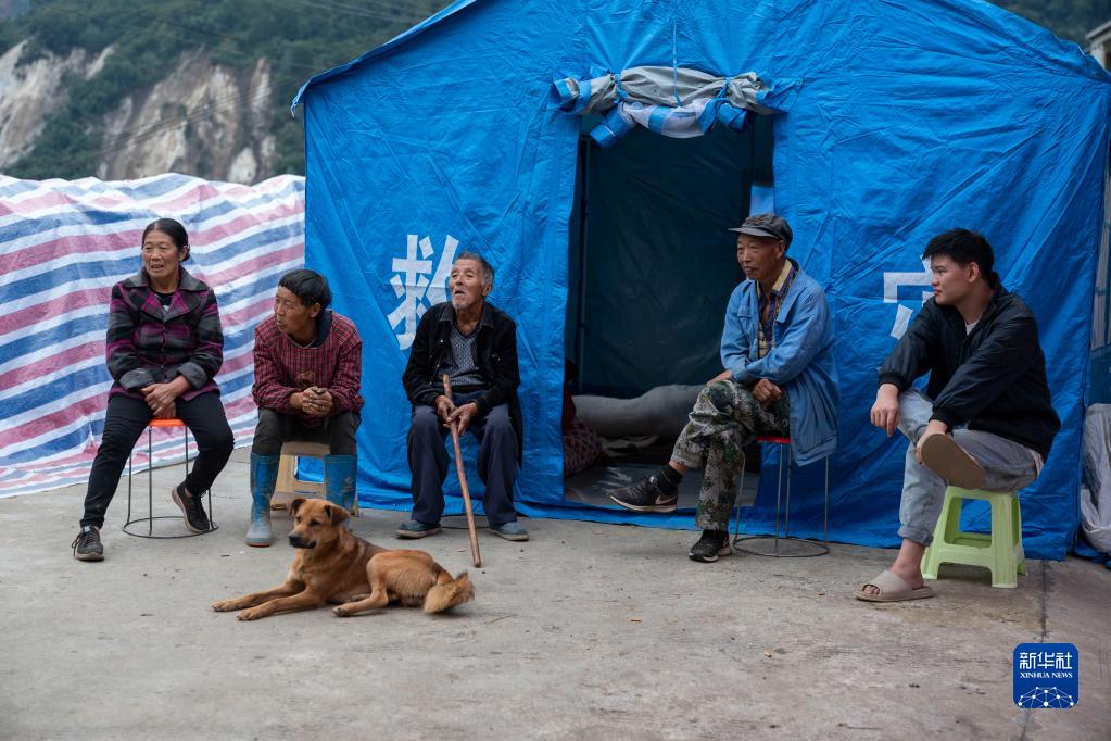 9月7日,在雅安市石棉縣王崗坪彝族藏族鄉(xiāng)幸福村二組,村民們在帳篷外休息。新華社記者 才揚 攝