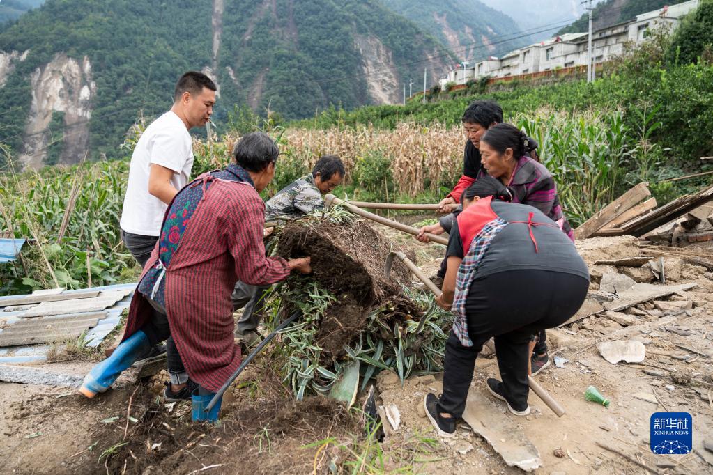 9月7日,在雅安市石棉縣王崗坪彝族藏族鄉(xiāng)幸福村二組,四川資陽消防救援隊員幫助村民清理廢墟。新華社記者 才揚 攝