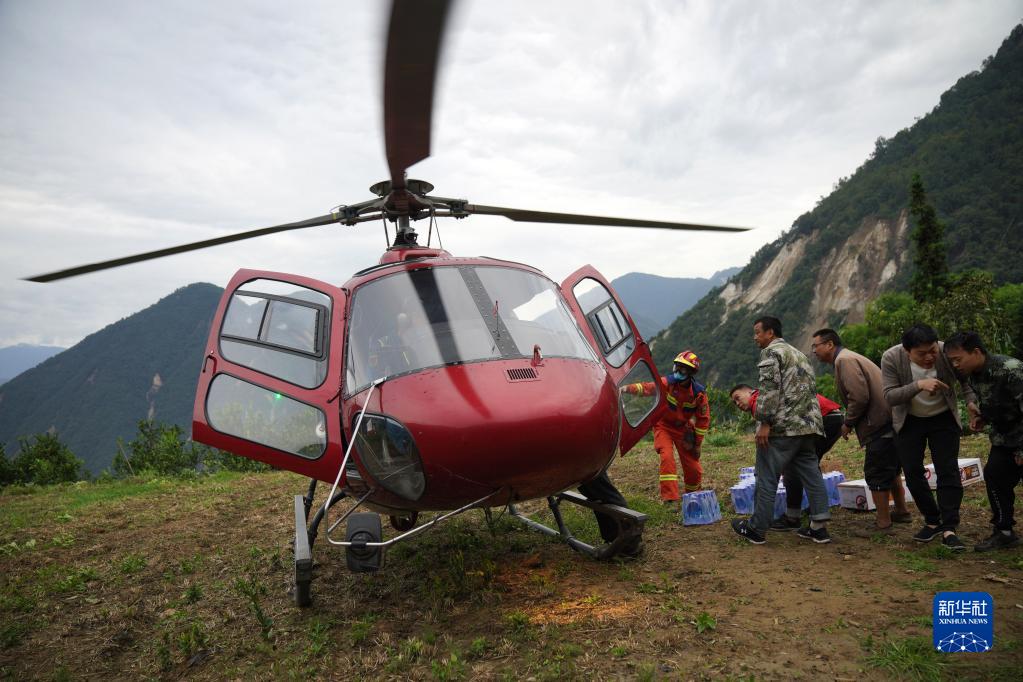9月7日,在雅安市石棉縣王崗坪彝族藏族鄉(xiāng)幸福村二組,村民與消防救援隊員搬運直升機送來的水和食物。新華社記者 才揚 攝