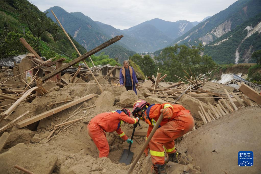 9月7日,四川眉山消防救援隊隊員在雅安市石棉縣王崗坪彝族藏族鄉(xiāng)幸福村二組,幫助村民在倒塌的房屋中找尋物品。新華社記者 才揚 攝