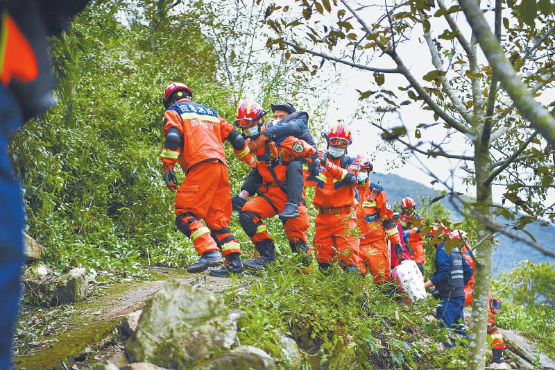 救援隊(duì)員協(xié)助紫雅場村最后一批村民下山,他們隨后將通過水路轉(zhuǎn)移至設(shè)在得妥鎮(zhèn)場鎮(zhèn)的受災(zāi)群眾安置點(diǎn)。 四川日?qǐng)?bào)全媒體記者 楊樹 攝