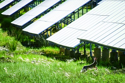一只野兔在光伏板之間跳躍而過。生態(tài)改善后,園區(qū)吸引了許多野生動物棲息。