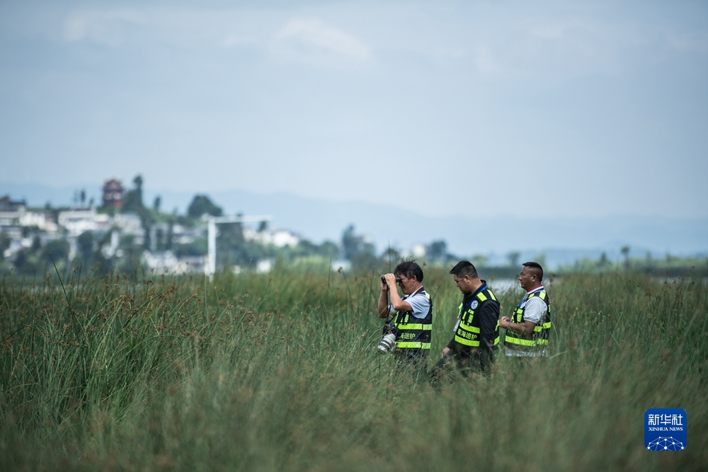 貴州草海國家級自然保護(hù)區(qū),草海巡護(hù)隊(duì)副大隊(duì)長劉廣惠(左一)和隊(duì)員在日常工作巡護(hù)中(2021年7月8日攝)。新華社記者 陶亮 攝