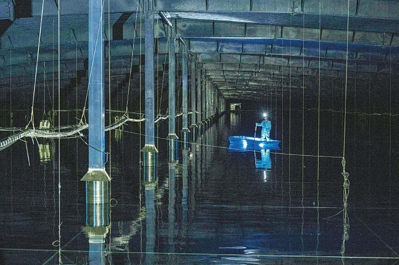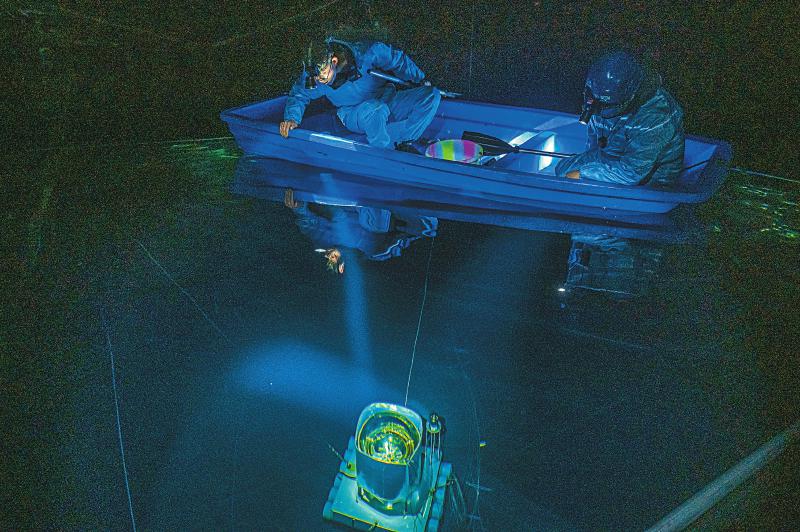 24日,陳明君和同事穿上潔凈服、戴上腳套,劃著小船進(jìn)入伸手不見(jiàn)五指的三號(hào)水池,他們要逐一檢查維護(hù)這里的探測(cè)器單元和電子學(xué)箱。船劃到指定位置,黑暗中陳明君的頭燈光束直射水底,水下碩大的探測(cè)器單元核心設(shè)備——光電倍增管,被照得清晰可見(jiàn),他和同事一起用“鉤子”把光電倍增管拉起,進(jìn)行檢查。“水池里的深度是4.5米,這些純凈水的透明度比自來(lái)水高三倍以上,切倫科夫光就從里面捕獲?!标惷骶嬖V記者。
