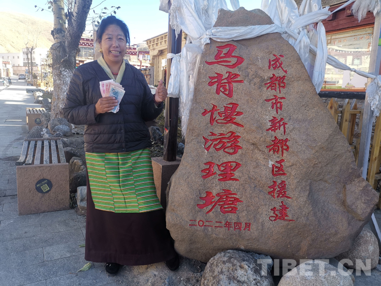 圖為四郎卓瑪在現(xiàn)金分紅后在項目石刻前留影