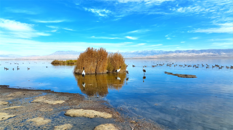 初冬時節(jié),在青海省海西蒙古族藏族自治州烏蘭縣都蘭湖國家濕地公園內,四只國家一級保護動物黑頸鶴,踏著黑色細長的腿在湖中閑庭信步,與斑頭雁、赤麻鴨一起嬉戲覓食,盡顯柴達木盆地濕地生態(tài)之美。
