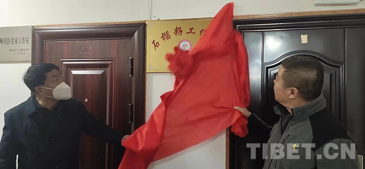 圖為海西州政協(xié)副主席張亞邦(右),州委統(tǒng)戰(zhàn)部副部長、州民宗委主任張啟忠(左)為工作室揭牌 攝影:東主才讓