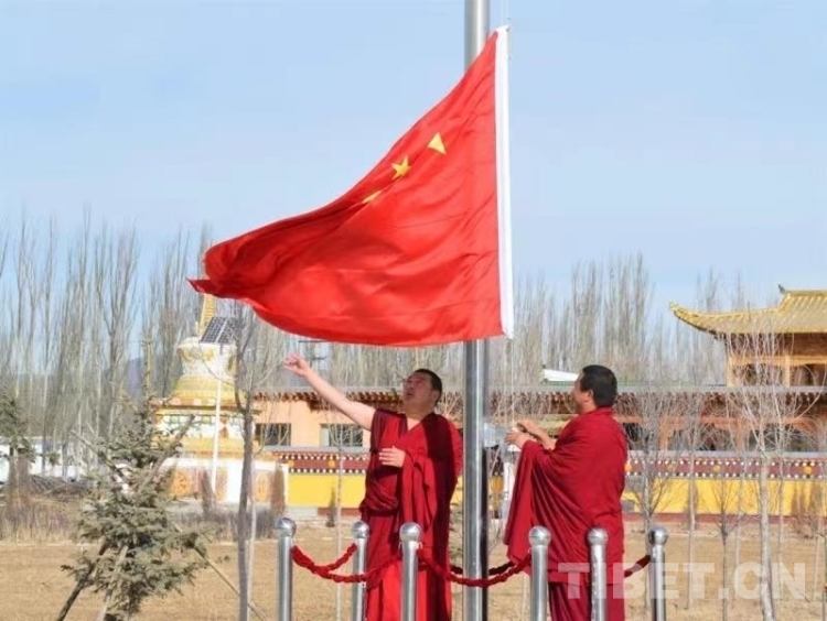 圖為青海省海南藏族自治州僧人在宗教活動場所升國旗