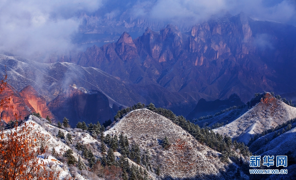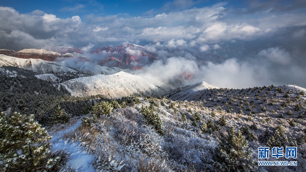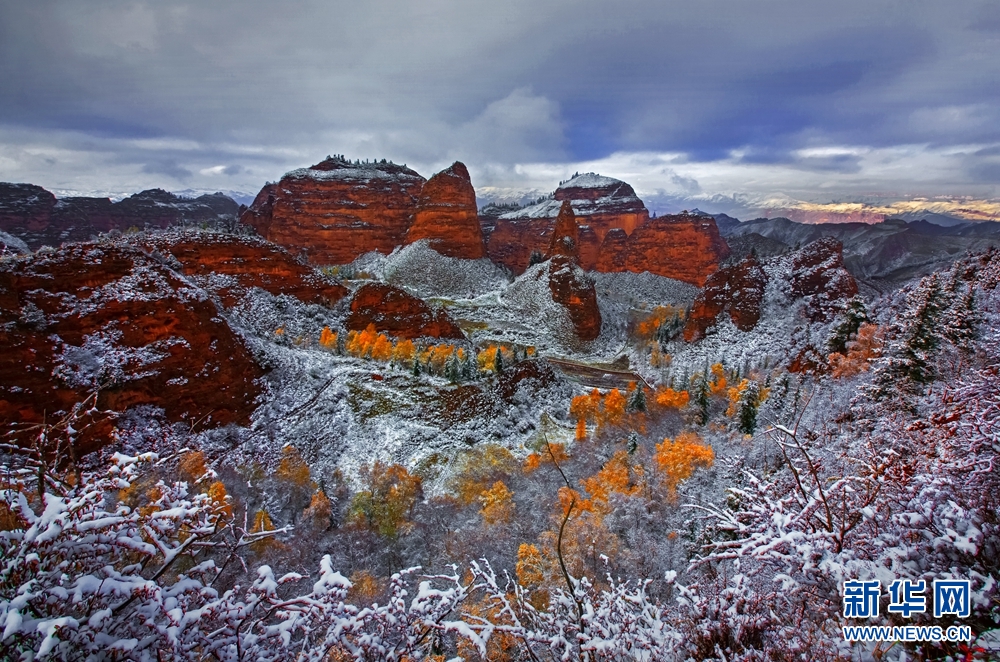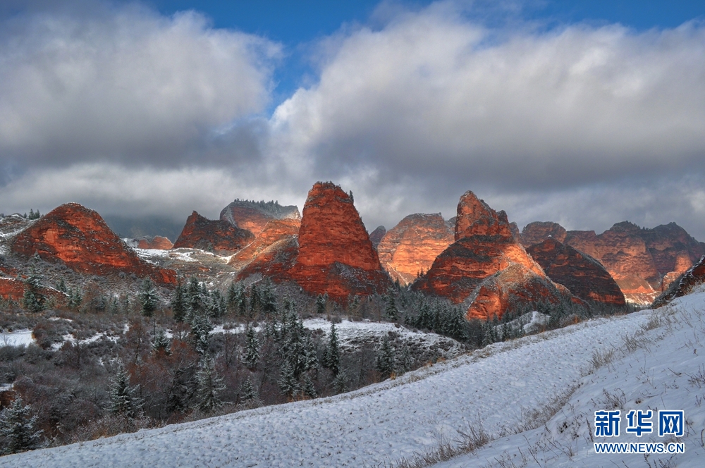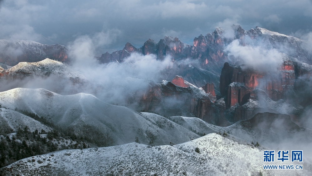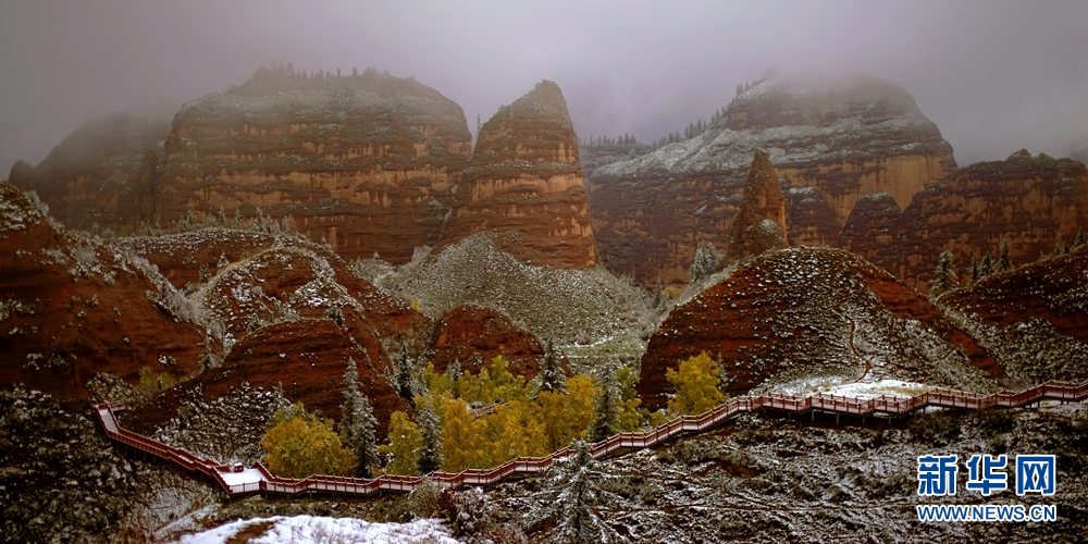 赤紅色的丹霞地貌與皚皚白雪相映成景,美不勝收。新華網(wǎng) 李河清 攝