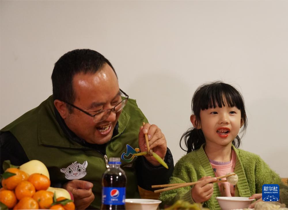 1月14日晚,管護(hù)員們?cè)谝黄鸪燥溩印P氯A社記者 周盛盛 攝
