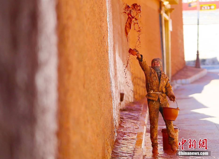 甘肅夏河縣拉卜楞寺內(nèi),匠人用傳統(tǒng)潑灑方法為寺院墻壁“美顏”。[詳細(xì)]