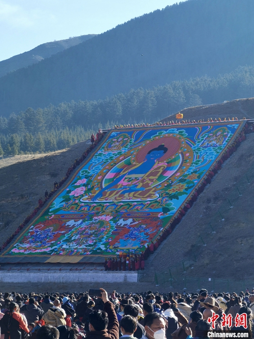 2月3日,中國(guó)農(nóng)歷正月十三,時(shí)隔三年,有“世界藏學(xué)府”之稱的甘肅拉卜楞寺重啟“瞻佛”活動(dòng),當(dāng)日展曬的巨型唐卡佛像吸引7萬(wàn)余僧俗民眾慕名瞻仰,祈禱新年風(fēng)調(diào)雨順、國(guó)泰民安。中新社發(fā) 屈鵬 攝