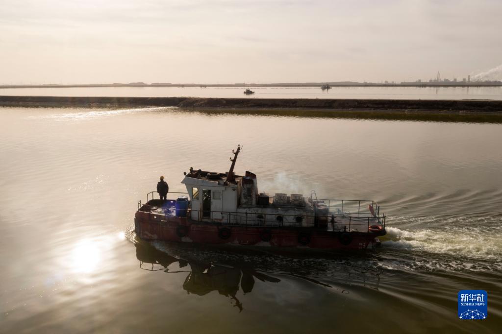 2月2日,賀連福乘坐工作船前往水采船。水采船在劇毒的鹵水鹽田中作業(yè),工作人員每天上下水采船都要通過工作船接駁。新華社記者 才揚(yáng) 攝