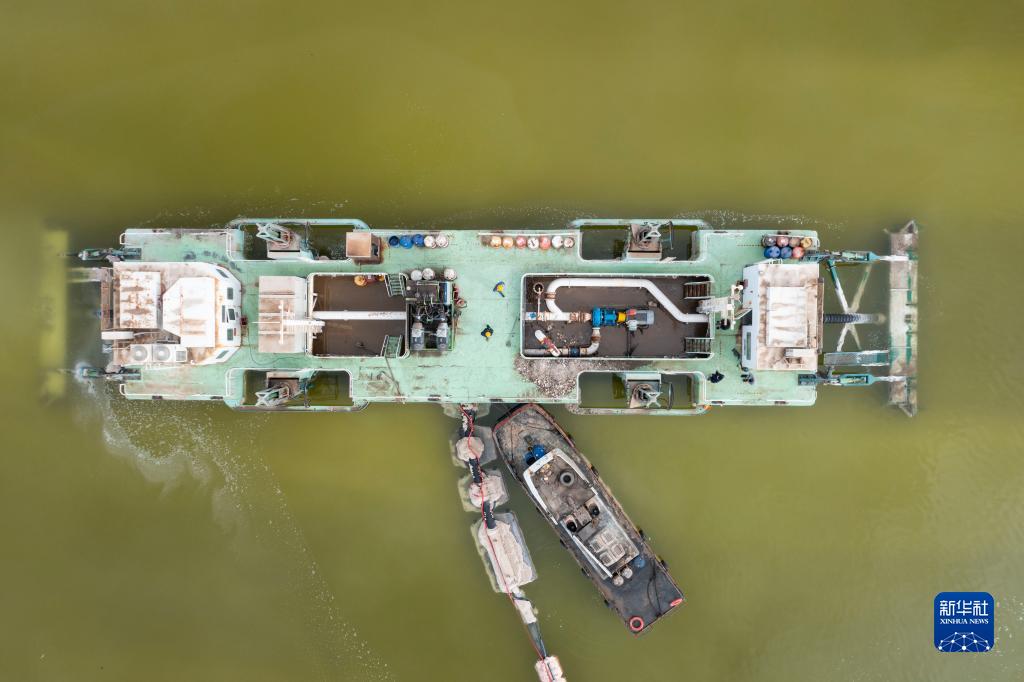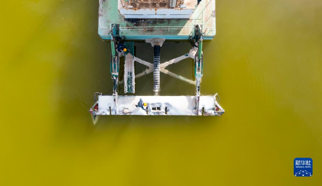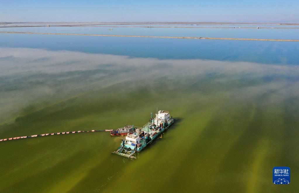 水采船在察爾汗鹽湖中作業(yè)(2月2日攝,無人機(jī)照片)。新華社記者 李賀 攝