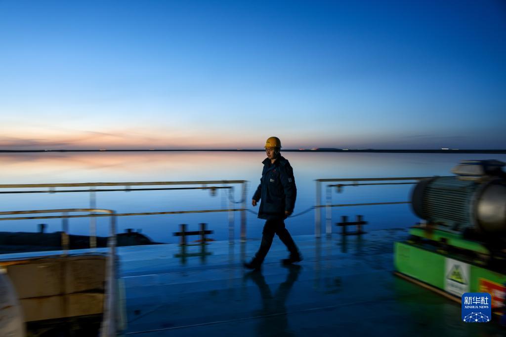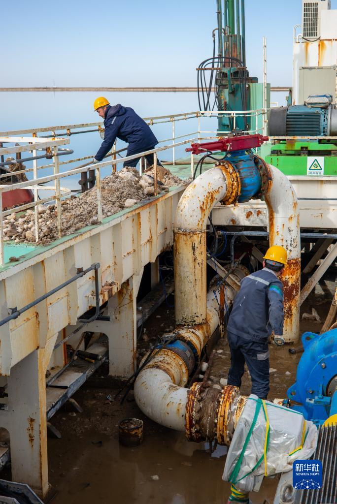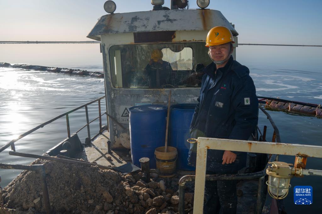 2月2日,賀連福(右)與同事駕駛工作船運(yùn)輸鹵水結(jié)晶。新華社記者 才揚(yáng) 攝