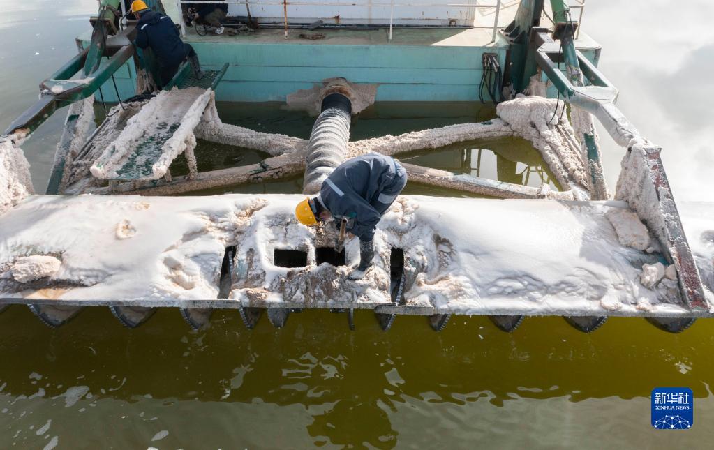 2月2日,賀連福與同事在清除水采船船身上的鹵水結(jié)晶(無人機(jī)照片)。新華社記者 才揚(yáng) 攝