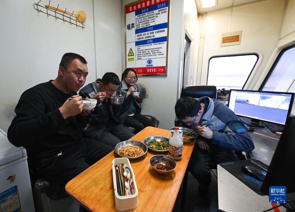 2月2日晚間,賀連福(左一)與同事在水采船上吃晚飯。新華社記者 張龍 攝