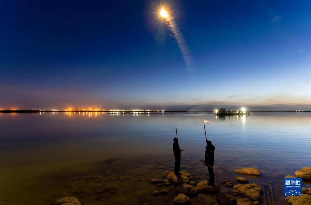 2月2日晚上,賀連福(右)與同事在鹽田岸邊燃放煙花,迎接即將到來的元宵佳節(jié)。新華社記者 劉金海 攝