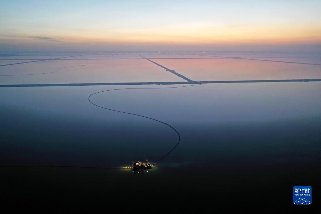2月2日,在青海省海西蒙古族藏族自治州的察爾汗鹽湖,一艘錨船在晨光中工作(無人機(jī)照片)。一名水采船船長通常負(fù)責(zé)管理兩個(gè)采收小隊(duì),采收小隊(duì)由一艘水采船、一艘工作船、一艘錨船組成。新華社記者 才揚(yáng) 攝