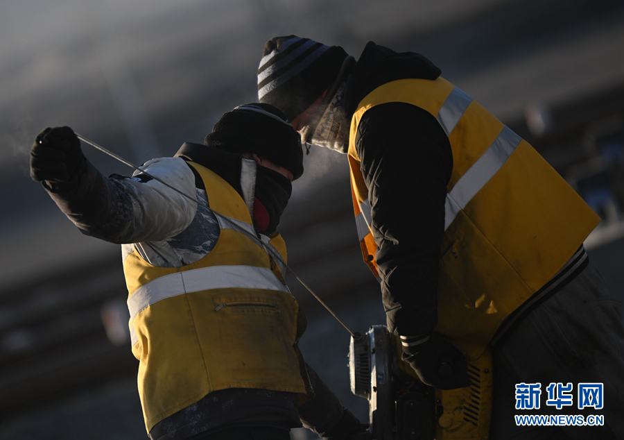 2月7日,中國鐵路青藏集團(tuán)有限公司格爾木工務(wù)段格南線路工區(qū)的職工在格爾木南站施工。新華社記者 張龍 攝