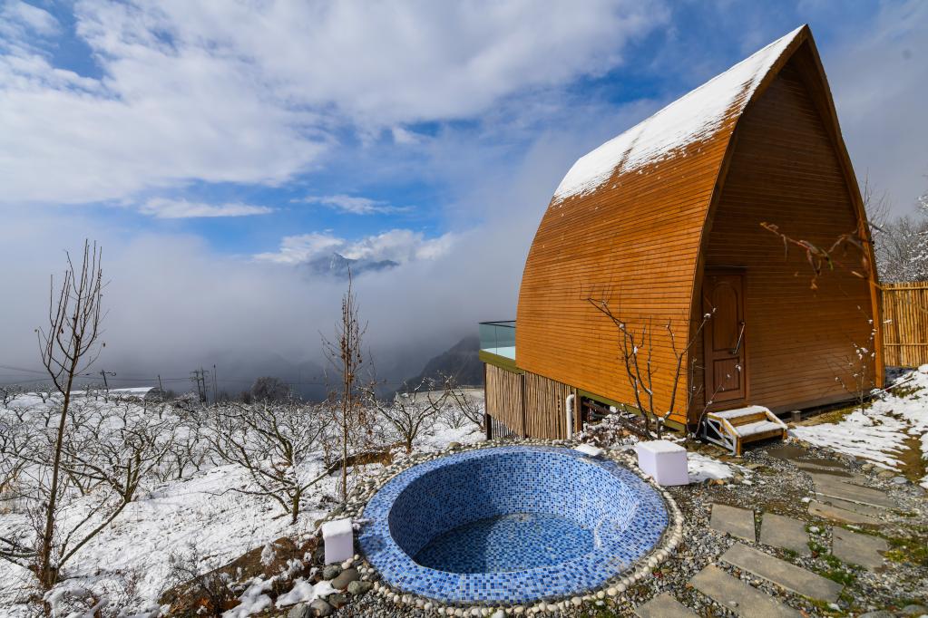 克枯村位于長江上游支流岷江邊的山腰上,是羌族聚居村寨。記者日前沿盤山公路進入村中看到,李子樹枝干上掛滿雪花,山林里6棟復(fù)式獨棟木屋民宿與遠處的雪山峽谷遙相呼應(yīng),旁邊是視野開闊的網(wǎng)紅餐廳,沿著旅游步道前行便看到幽蘭深邃的冰瀑群。