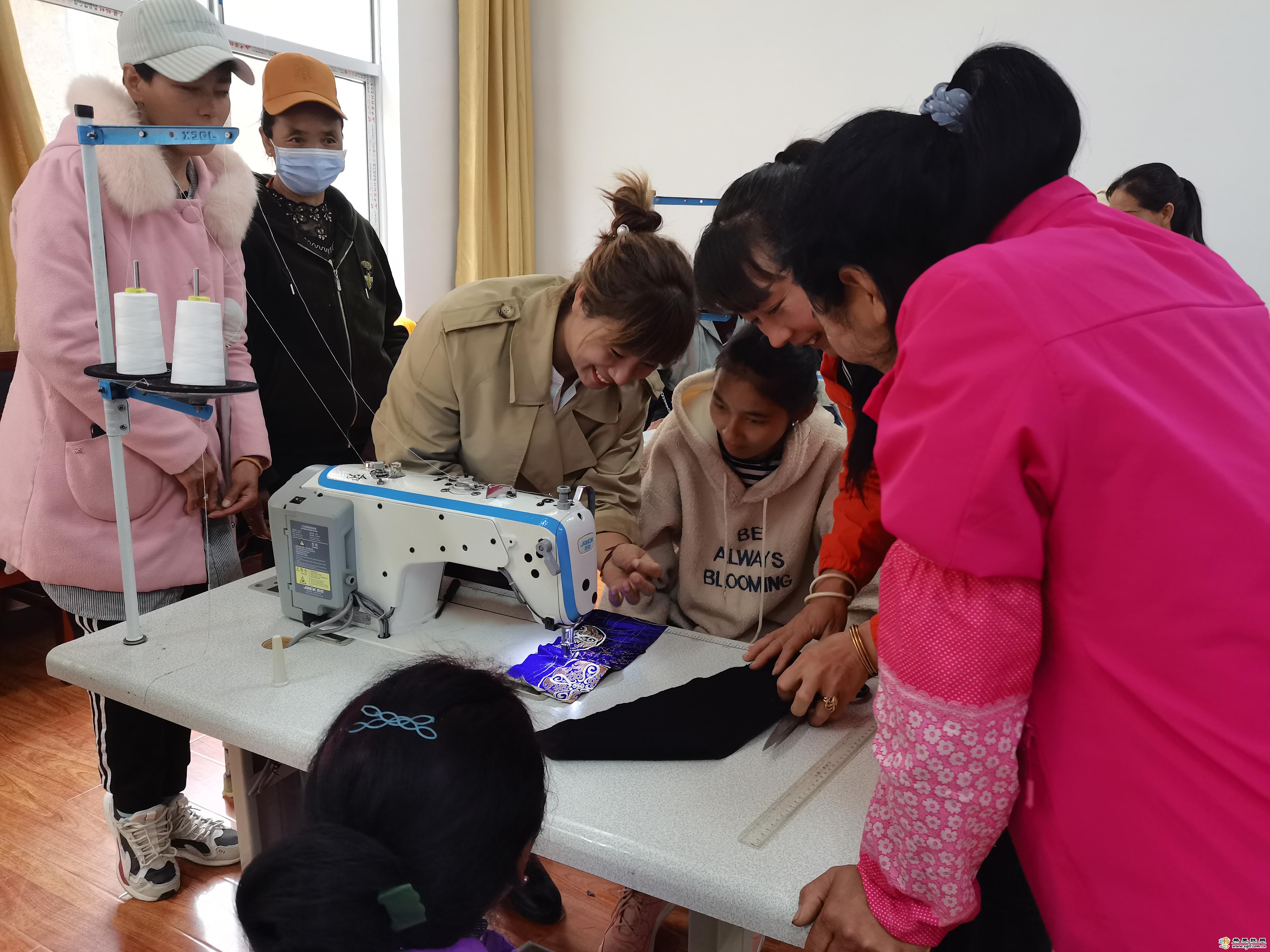 (春花(左三)手把手教授員工制衣技術(shù)。)