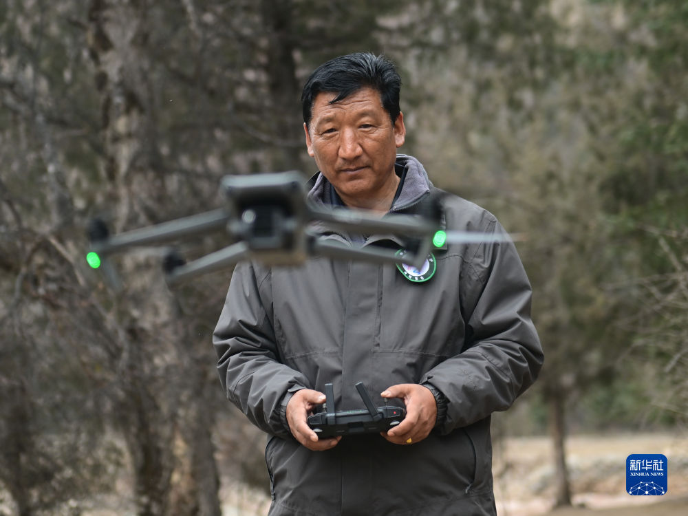 3月24日,在青海省黃南藏族自治州麥秀林場,護林員使用無人機巡護林區(qū)。新華社記者 王艷 攝