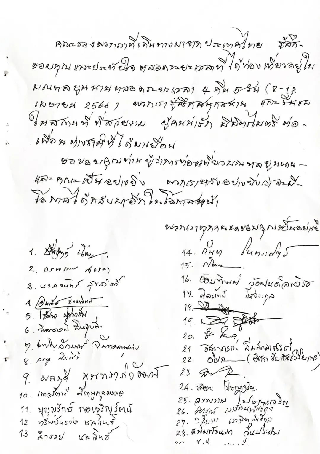 紙短情長!一封寫有30位泰國游客名字的感謝信
