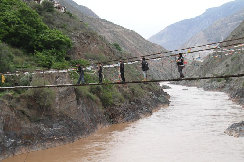 近日,“有一種叫云南的生活”大型調(diào)研采訪活動(dòng)德欽分隊(duì)十多名來自省內(nèi)外的記者采訪團(tuán)走進(jìn)佛山鄉(xiāng),茶馬古道梅里雪山段瀾滄江上的竹篾溜索、鐵索橋,以及如今還在使用的便橋引起了大家極大興趣。三種渡江方式,代表了三個(gè)時(shí)代的變遷。離此處500米左右下游的鋼筋混凝土大橋則是近幾年建成的,寬約十米的橋面上汽車轟鳴而過。