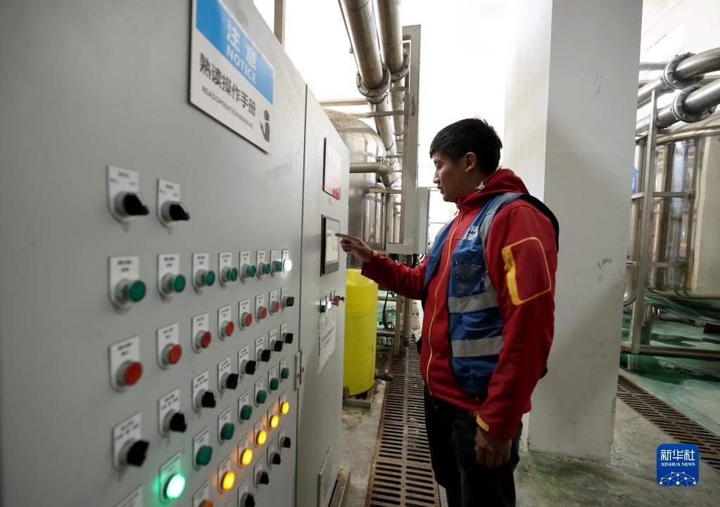 4月22日,在高海拔宇宙線觀測站觀測基地水處理機(jī)房,工作人員在操作水處理相關(guān)程序。新華社記者 金立旺 攝