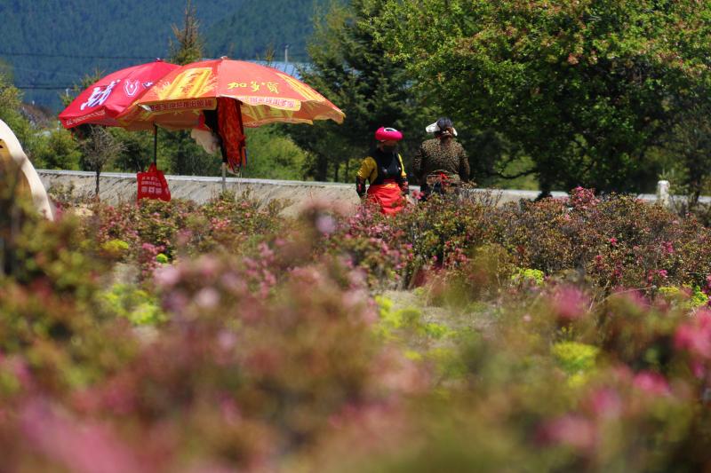 夏天,位于香格里拉市小中甸鎮(zhèn)的杜鵑花海競相綻放,紫色、粉色的花朵開成了海,與藍天白云遙相呼應(yīng),藏房點綴其間,美不勝收。每當花季,當?shù)氐睦习傩赵诨ê_厰[起特色美食,牦牛酸奶、苦蕎粑粑、酥油茶等美食供游客享用,坐在花海邊,品嘗當?shù)靥厣朗?,是這個夏天小中甸花海獨有的浪漫。
